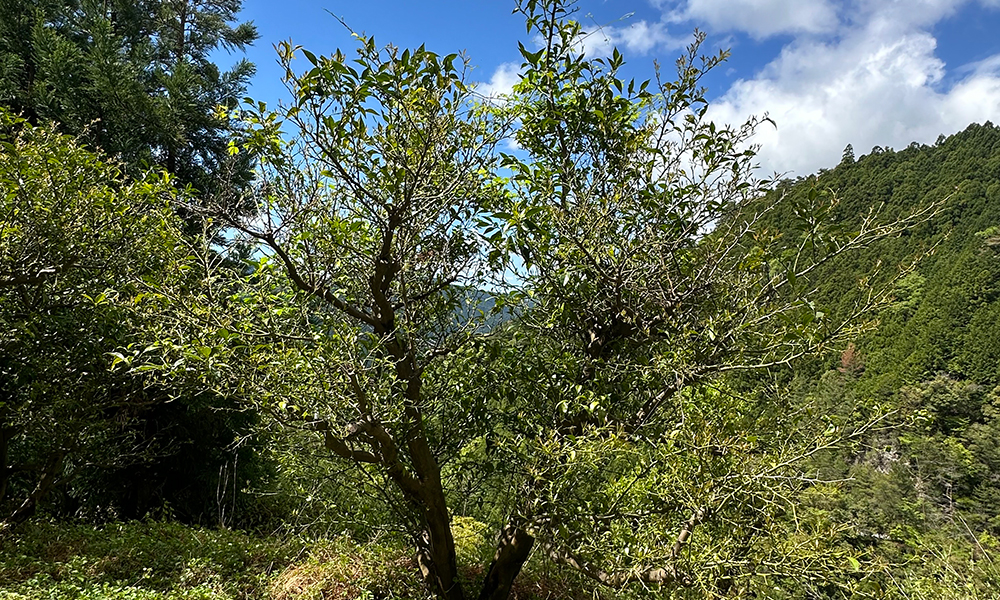 5月の奥物部は新緑がまぶしく、山々は深い緑に包まれていました。急斜面に根を張る実生ゆずは、樹齢数十年を超える高木が多く、力強い生命力を感じさせました。この季節の果実はまだ青く小さいながらも、枝葉に漂う香気は鮮烈で、確かに原種ゆずの存在を物語っていました。